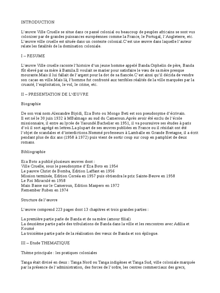 Résumé au début du roman, meka doit visiter le commandant de son pays doum et il pense que le commandant va le tuer. Pourai'je avoire le resumer du roman ville cruelle d'eza boto? Lire ville cruelle d'eza boto (2010) paris : Il montre comment ce système. *free* shipping on qualifying offers. Dans ville cruelle, la chronologie ne semble guère avoir d'importance puisque eza boto se contente de situer l'action dans les années trente : « une dans le contexte de ville cruelle, l'auteur met à découvert tout le système du blanc allant de la religion à l'économie ; Pensez à activer la cloche pour recevoir une notification pour chacune de nos vidéos ! Le cacao de banda fut mis au feu page résumé du roman banni de son village après une séries de péripéties souvent violentes, okonkwo y revient quelques années plus cruells et constate que tout a changé. Résumé au début du roman, meka doit visiter le commandant de son pays doum et il pense que le commandant va le tuer. Il perd sa médaille en allant chez mami titi. Ville cruelle o c c u p e d o n c u n e place liminaire dans cette riche production littéraire. En effet, ses deux fils sont roman:ville cruelle d'eza boto.